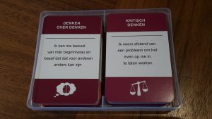 Ik blader door de kaarten totdat mijn oog op het kaartje valt met de tekst. “Ik ben me bewust van mijn beginniveau en besef dat dat van anderen anders kan zijn.” euh NEE